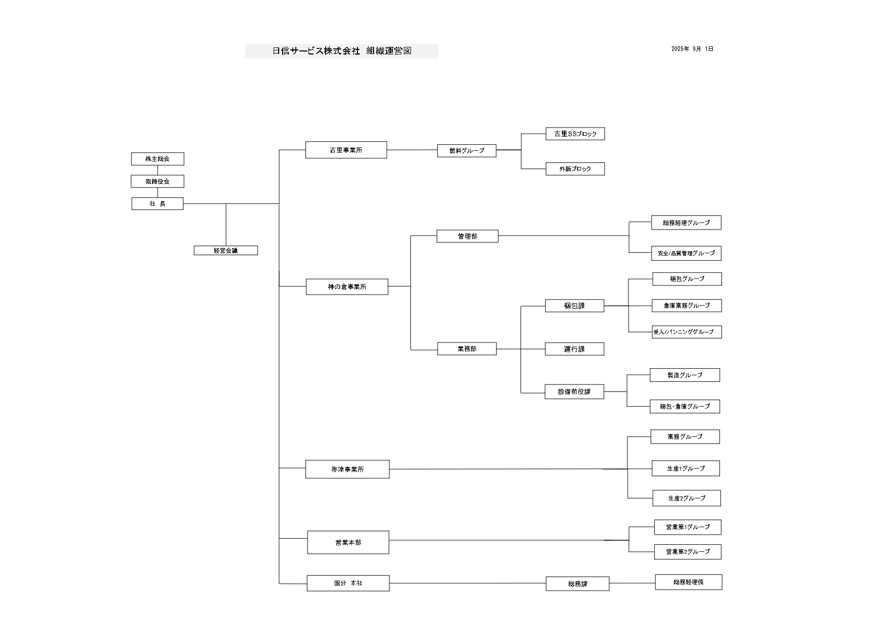 会社概要 OUTLINE 「驚き」と「感動」を届ける魅せる企業 お客様と「繋がる」ことから始まります 当社の主要業務は、運送・梱包や倉庫業といった物流に関わる業務ですが、ガソリンスタンドの運営も行っております。 私達はこれまで全社員が一心同体で進んできました。心をひとつにできた核となる言葉は「驚き」と「感動」です。 「驚き」とは「ここまでやってくれるの」、「こんなこともできるの」ということ、「感動」とは「本当に良かった」、「楽しかった」、「ありがとう」と感じてもらうことです。 神の倉事業所の主要業務は物流ですが、私達はこれを「物流業」ではなく「サービス業」としてとらえています。ただ単に物を運ぶだけではなく、集荷から梱包、保管、輸送までお客様とって最適な物流マネジメントは何かを考え、提案していきます。 荷物を送られるお客様、荷物を受け取られるお客様はもちろん、その荷物を生産されるお客様、お使いになるお客様、全ての人たちが「繋がる」お手伝いをします。 古里事業所も同様に、「驚き」と「感動」を合言葉に、「「モノ売り」から「コト売り」へ」を実践しています。例えばガソリンスタンド、ガソリンやタイヤ、オイルという目に見えるモノを売るだけでなく、お客様が安心して過ごせるカーライフをサポートすることを心掛けています。 私達の仕事は物を運んだり販売したりすることなので、ハードをとても大事にしています。ただ、同等もしくはそれ以上に大切に思っているのがソフト、つまり人の心です。 ハードよりもハート。 これが私達のビジネスの公式です。 組織図 ※クリックで画像を表示 >PDF版はこちら 沿革 昭和58年8月 日信工業㈱運輸課から独立、日信サービス運輸㈱を設立 昭和58年10月 一般区域貨物自動車運送事業を開始、資本金4千万円 平成2年4月 日信サービス㈱に社名変更、本社を国分から古里に移転 増資により資本金8千万円 平成2年8月 古里給油所オープン 平成3年4月 本社社屋(サンライズヒル古里)が完成 平成3年5月 増資により資本金1億円 平成3年10月 一般貨物自動車運送事業の認可を得る 平成4年3月 小型自動車分解整備事業(二輪車)の認可を得る 平成5年5月 輸出梱包業務開始 平成9年10月 タイヤ・カー用品ショップオープン 平成11年6月 新田営業所新設(運行及び輸出梱包事業) 平成14年10月 殿城営業所新設(運行及び輸出梱包事業移転) 平成18年8月 神の倉事業所新設(運行及び輸出梱包事業移転) 平成18年9月 本社移転(大信産業㈱内) 平成28年6月 神の倉事業所 保税蔵置所 認可取得 平成30年3月 神の倉事業所 倉庫業認可取得 令和2年3月 神の倉事業所 荷役設備係 業務開始 令和5年7月 神の倉事業所 設備荷役工場新設 令和6年4月 日栄産業株式会社を吸収合併 祢津事業所として操業開始 令和6年5月 神の倉事業所 ISO9001認証取得 令和7年8月 古里事業所 サンライズヒル閉店 主要取引先 Astemo株式会社 アート梱包運輸株式会社 NX商事株式会社 南海部品株式会社 東部金属株式会社 Astemo上田株式会社 三谷商事株式会社 出光NTG株式会社 ミヤバラガス株式会社 吉田工業株式会社 伊藤忠エネクス株式会社 株式会社ユシロ 株式会社近鉄エクスプレス 日本通運株式会社 株式会社レゾナック・ブレーキ 株式会社城南製作所 日精樹脂工業株式会社 三菱ケミカル株式会社 株式会社竹内製作所 本社(大信産業株式会社内) 〒386-0016 長野県上田市国分1丁目1-9 TEL:0268-26−3611 FAX:0268-23-8883